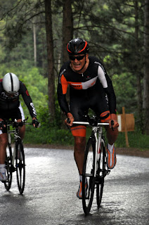 Am Beginn der Steigung konnte ich wieder kurz vorfahren. Inzwischen hatte es zu regnen begonnen, das war auch nicht geplant, denn die ZAMG hatte wieder einmal geirrt, und der letzte steile Km war dann ordentlich nass. Walter überholte mich wieder aber mein Rückstand hielt sich in Grenzen und ich war froh nicht schieben zu müssen. Eine kurze Schrecksekunde gab es noch knapp vor dem Ziel als mich an der steilsten Stelle vor einer scharfen Kurve Wolfgang „Holzwurm“ überholte.